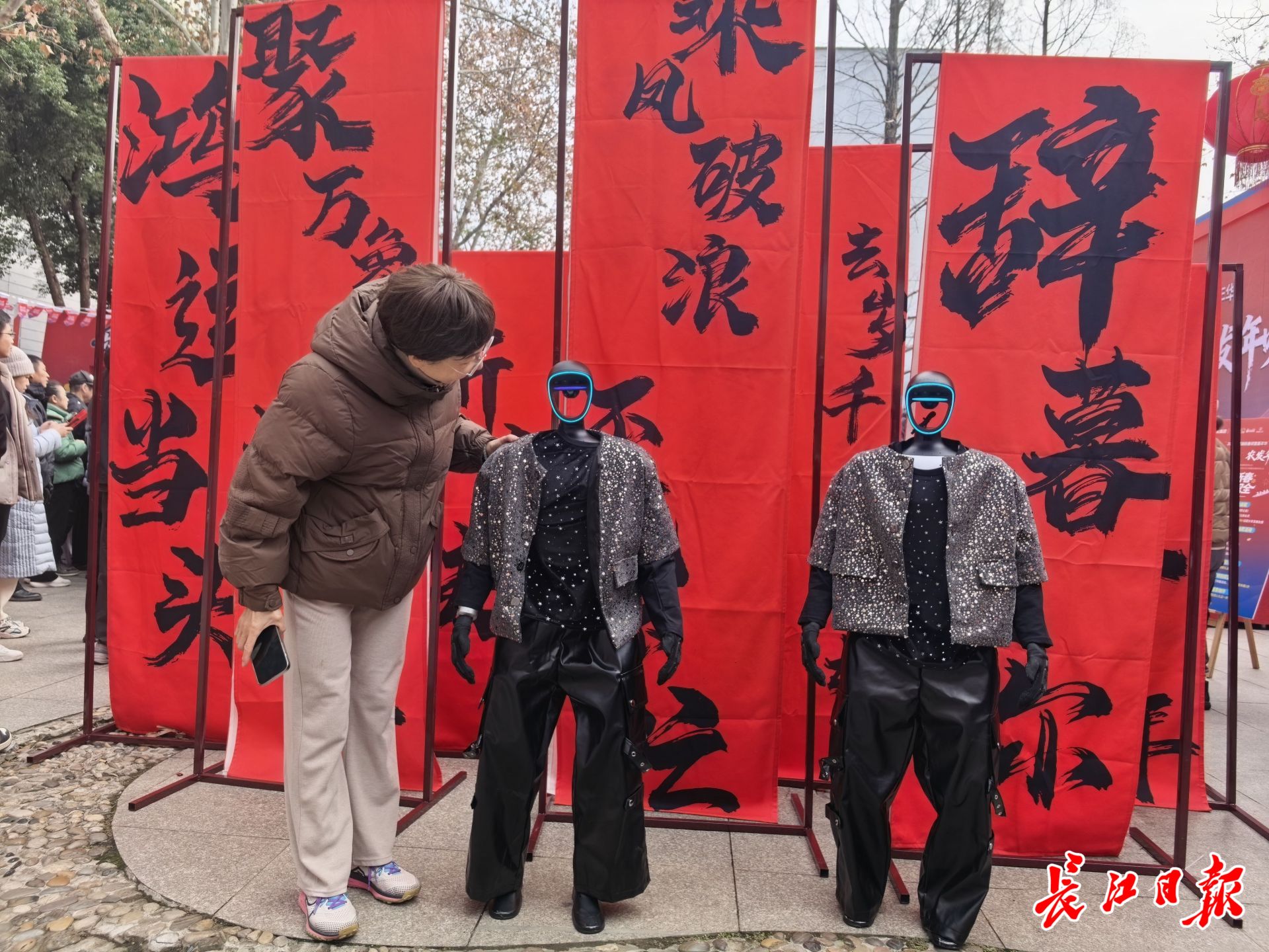 2月1日上午,2026年水果湖新春邻里嘉年华活动现场,2台机器人身着黑金配色的亮片流苏外套和黑色皮质阔腿裤,跳了一曲《火力全开》。灵活的身姿、精准的动作,赢得观众连连喝彩。