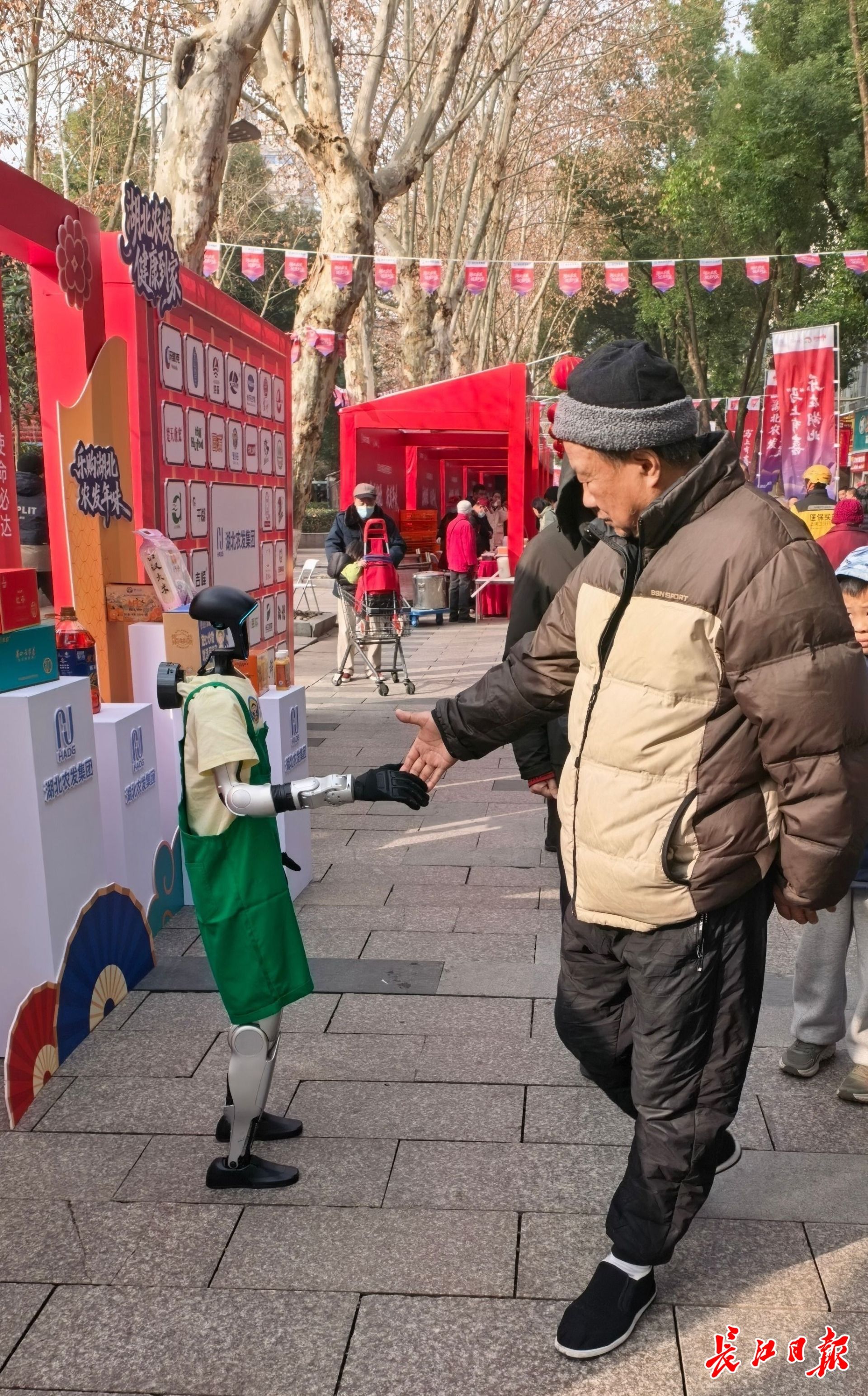水果湖步行街,市民与机器人合影。记者孙笑天摄