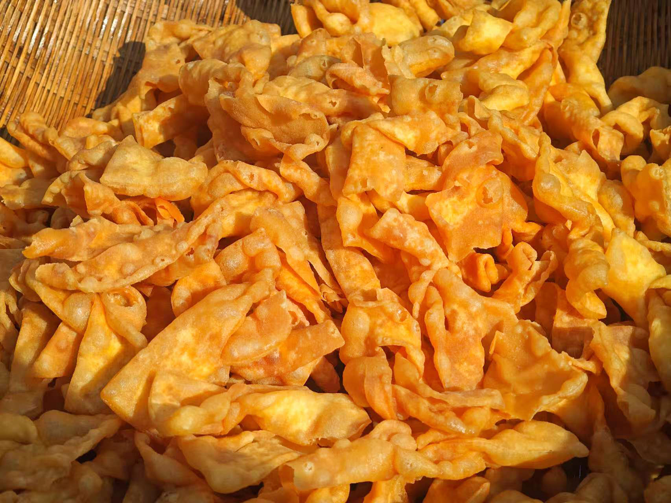 “中间划上两道小口,双手一翻,蝴蝶结就成了!”黄祥凤演示着关键步骤,指尖一动,平平无奇的面片便化作灵动的翻饺子。此时,油温升至七成热,转小火慢炸,翻饺子在油锅里渐渐染上金黄,滋滋作响的热油裹挟着麦香飘散开来,引得邻居家的孩子循着香味跑来。“以前过年,左邻右舍都互相帮忙,你家揉面、我家炸制,炸好的翻饺子分着吃,香味能飘半个村子。”黄祥凤回忆道,如今生活好了,大家还是习惯自己动手做翻饺子。