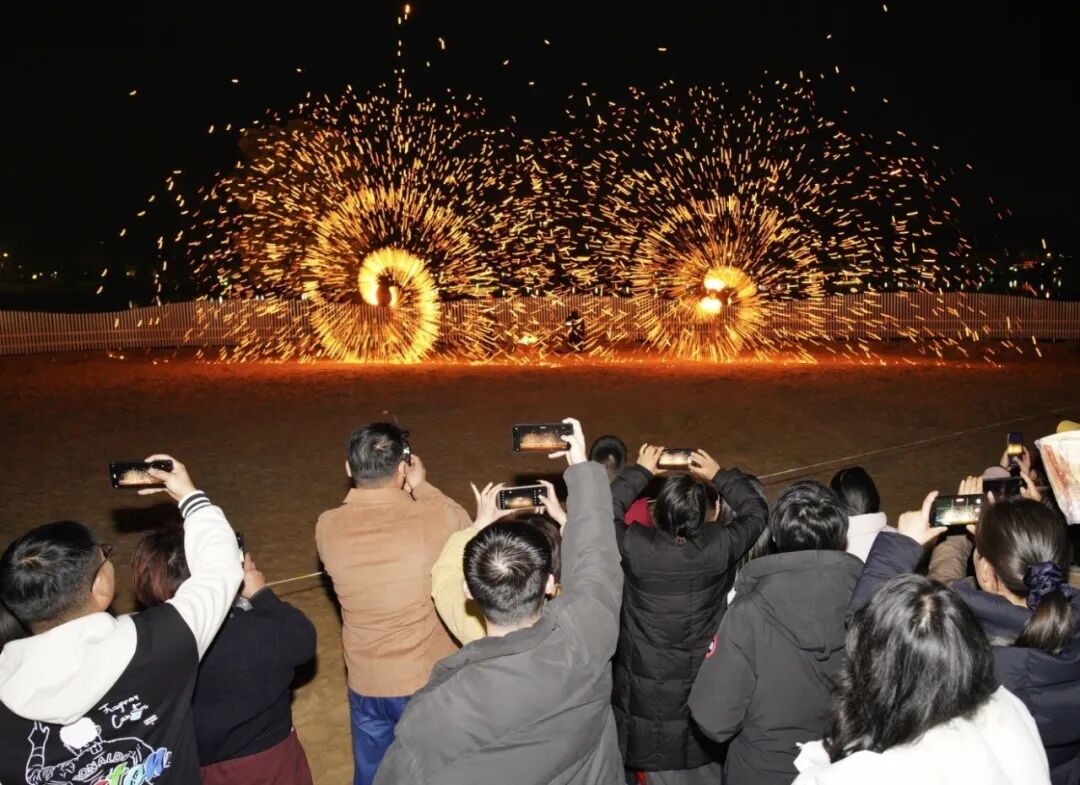 市民游客在未苏湾观看“打铁花”与“铁花风火轮”非遗表演 李航/摄