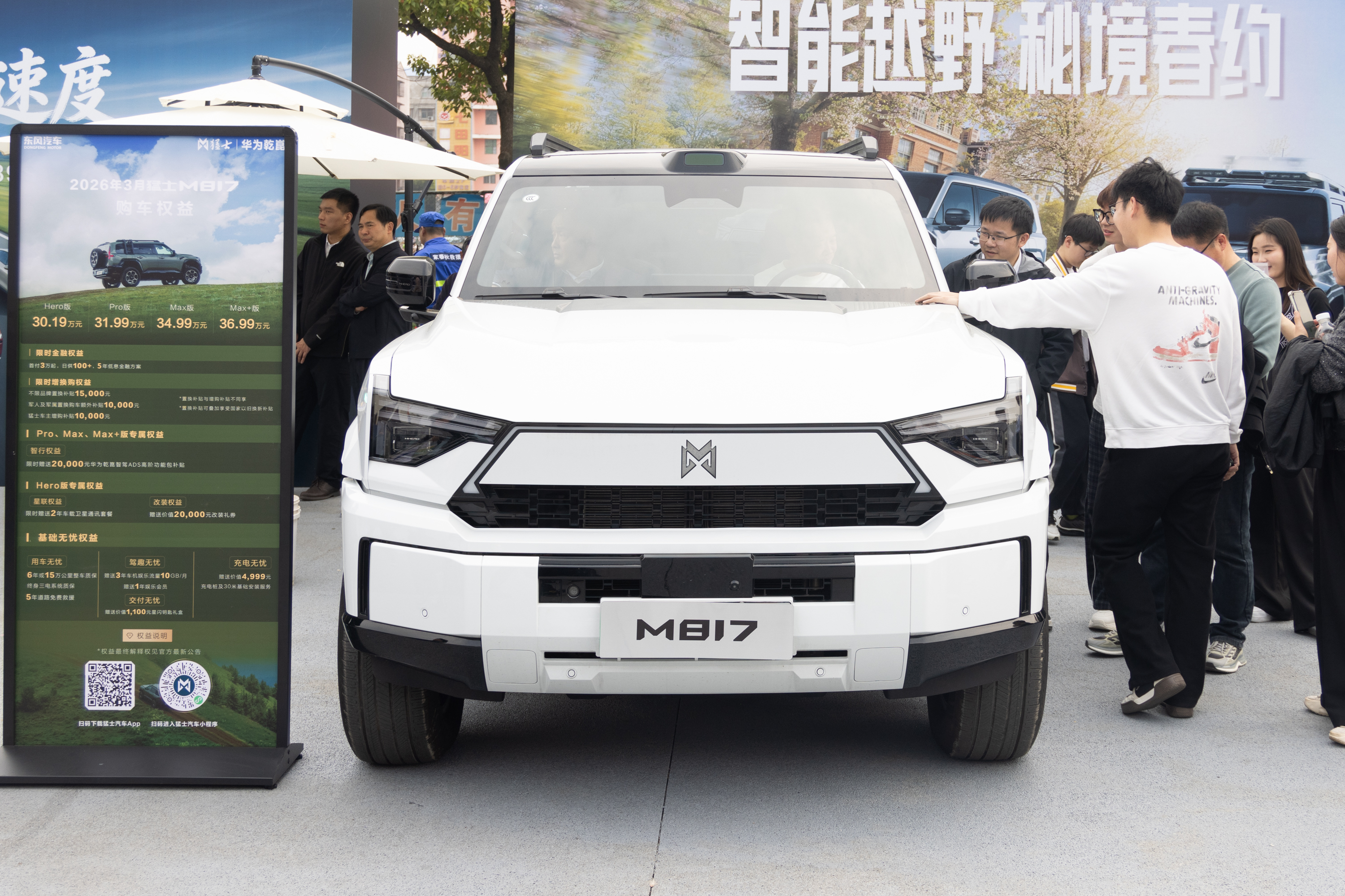 不少市民在一辆猛士M817车前围观咨询,频频称赞这辆车太酷了。一旁的工作人员介绍该车可适应戈壁、高原、雪地等复杂地形,并留下想体验试驾市民的联系方式。
