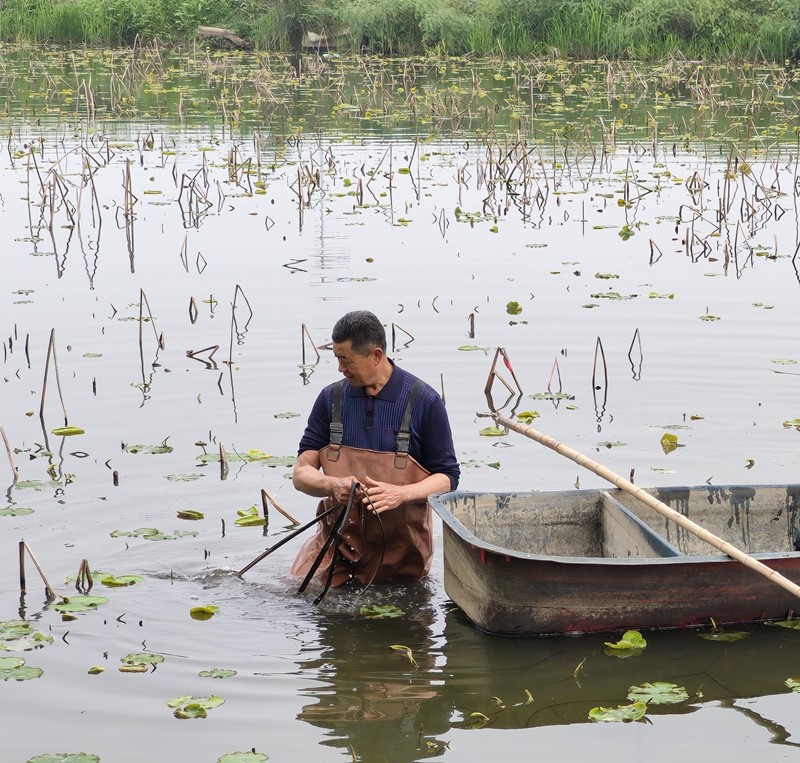 土地的模样变了,种植理念也随之更新。“现在种藕,靠的是新法子、新观念。”熊治贵指着水中的藕苗介绍,高毒农药已被生物菌剂取代,水位也根据生态需求科学调控。虽投入增加、管理更细,但种出的莲藕愈发玉白脆甜。“咱们的‘生态藕’,口碑好,能卖个好价钱。”他的语气里满是笃定。